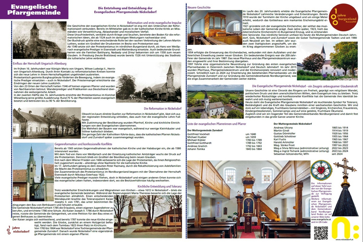 Wer künftig durch Nickelsdorf spaziert und am Raiffeisenplatz verweilt, kann seinen Wissenshorizont erweitern: Die neue Tafel bietet spannende Einblicke in die Geschichte unserer Pfarrgemeinde, ergänzt durch historische Fotos. Außerdem finden sich ein Link und ein QR-Code, welche direkt zu unserer Internetseite führen – so bleiben alle Interessierten jederzeit auf dem Laufenden über aktuelle Veranstaltungen, Gottesdienste und Neuigkeiten. Getreu dem Motto "Ein kleiner Schritt zum Raiffeisenplatz, aber ein großer für unsere Gemeinschaft", laden wir alle herzlich ein, vorbeizuschauen und sich ein Bild von unserer lebendigen Pfarrgemeinde zu machen!