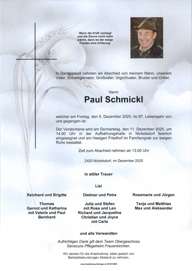 Paul Schmickl verstorben am 05.12.2025 im 97. Lebensjahr |